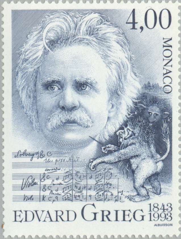 Портрет композитора Эдварда Грига, ноты и тролии — персонажи сюиты «Пер Гюнт», созданной по мотивам драматической поэмы Ибсена.