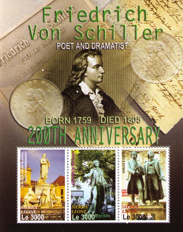 Марки изданы в малом листе. На поле листа портрет Шиллера (Герхард фон Кюгельхен, 1816—1817, по оригиналу А. Девериа), памятные монеты в 2 рейхсмарки, отчеканенные в честь 175-летия Шиллера в 1934, страницы рукописи.