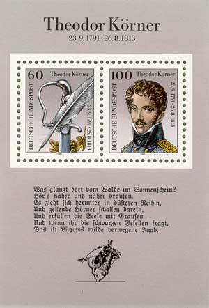 Марки изданы в блоке. На нижнем поле блока — строфа из стихотворения Кернера и прусский кавалерист.